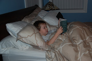 I suggested he just lay in my bed and rest until I was finished and instead he went and got the latest book Harry Potter book that we are reading together.